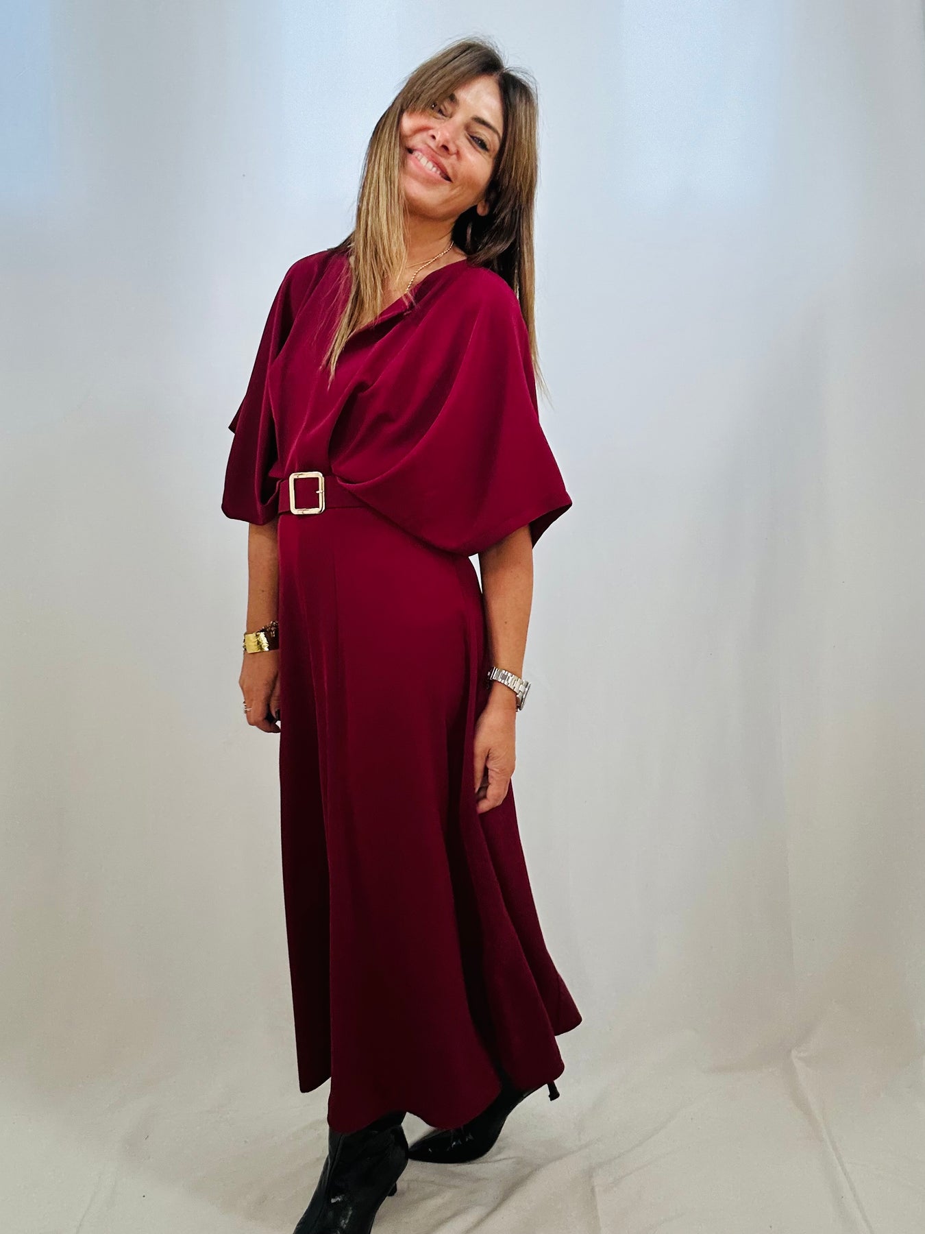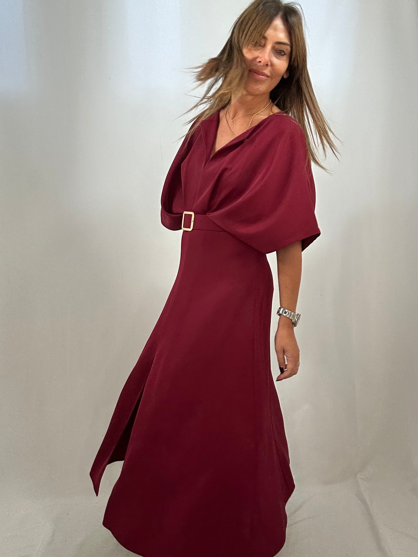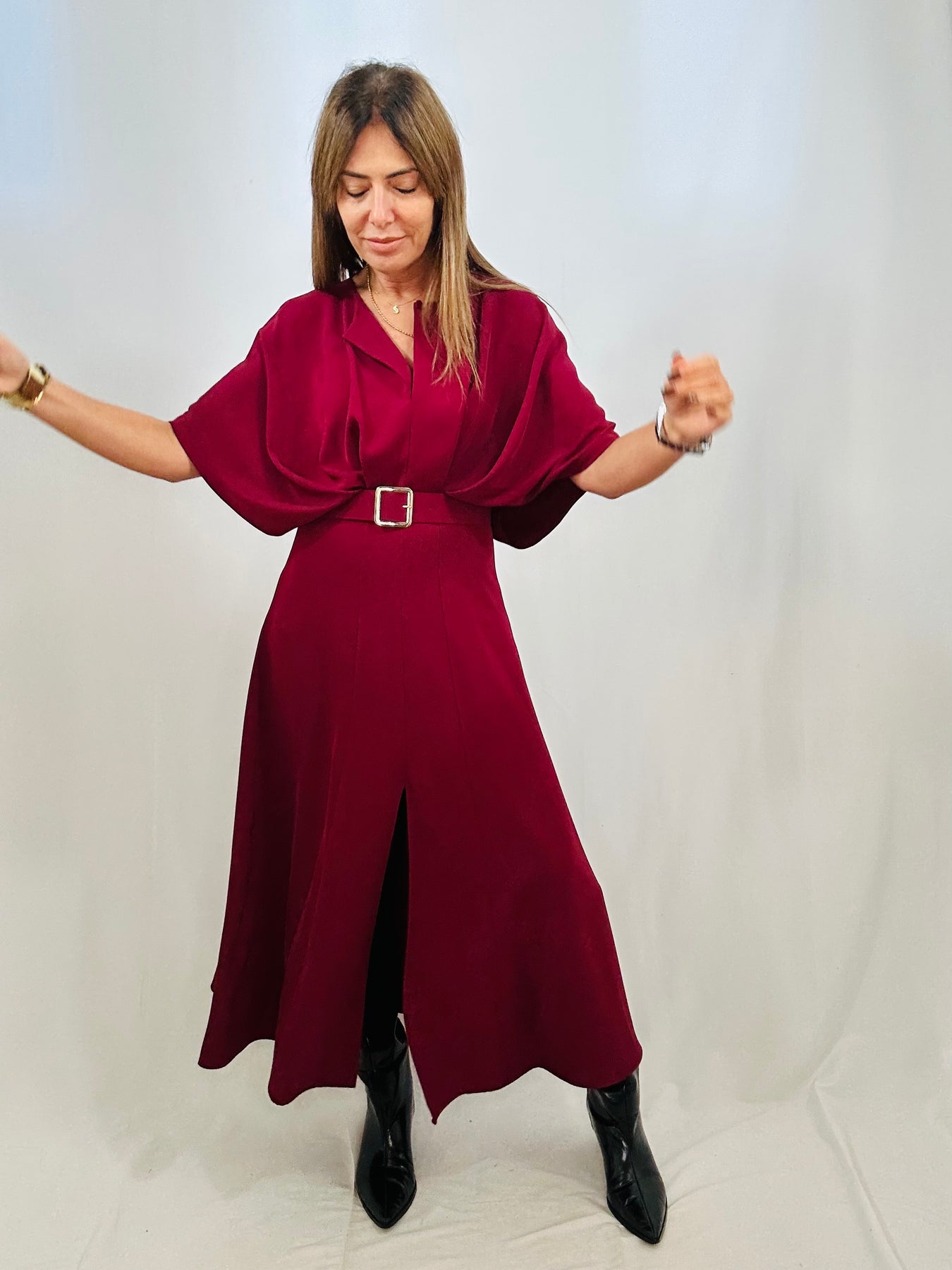 Crafted from premium berry-colored fabric, the Amora dress features a flattering belted waist and elegant mid-length, making it ideal for any occasion. The soft, flowing material and fluted mid sleeves add a touch of sophistication, while the tailored fit emphasizes your natural curves. A must-have for stylish and refined looks.