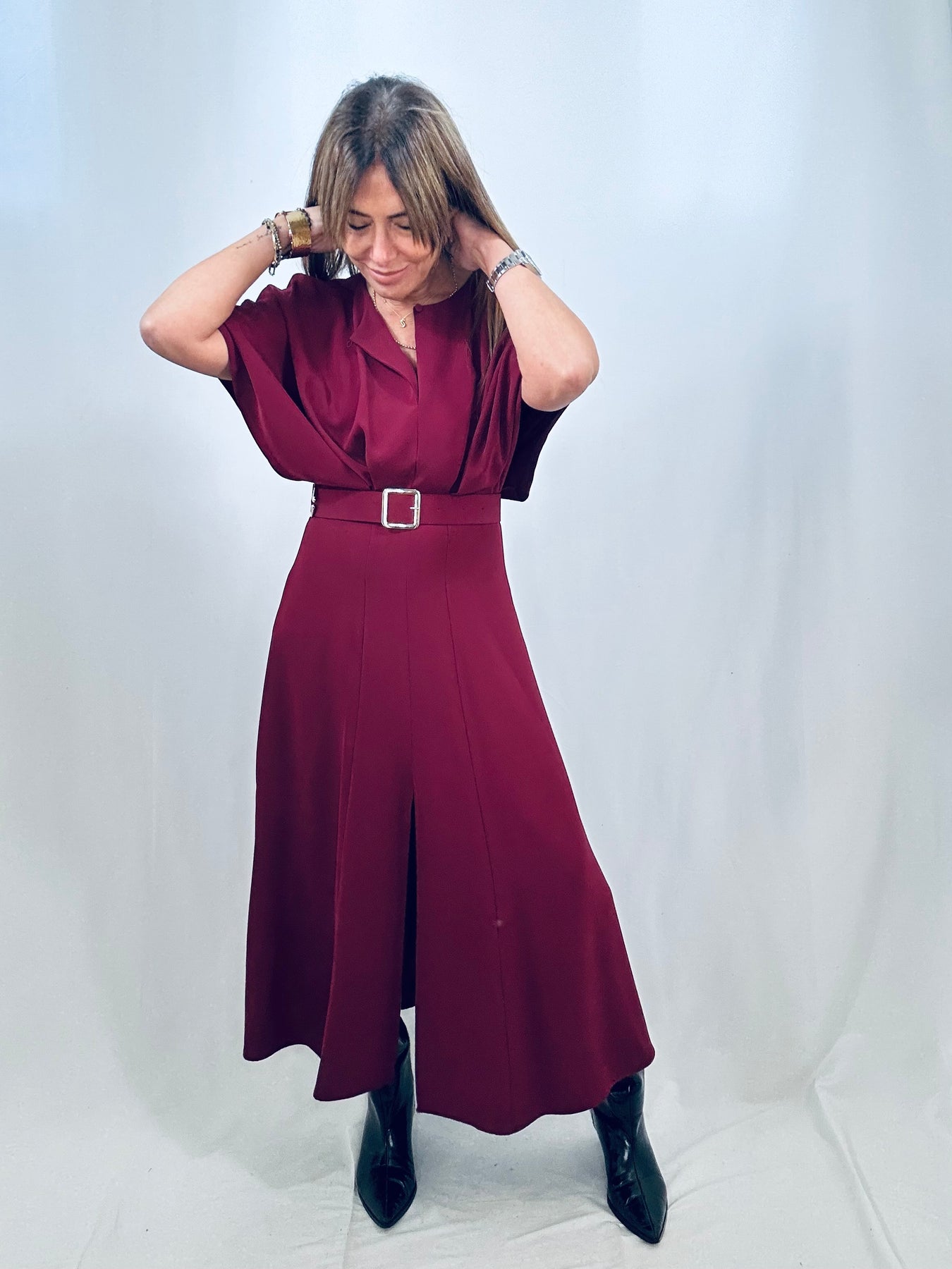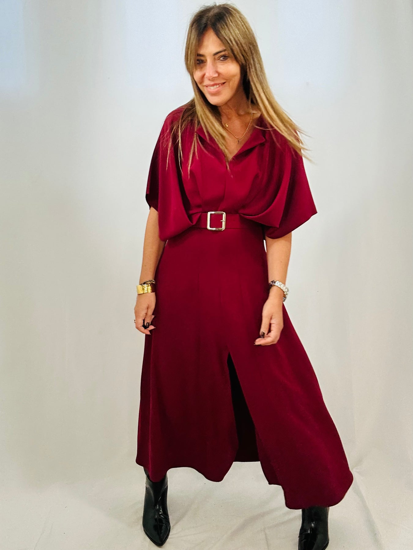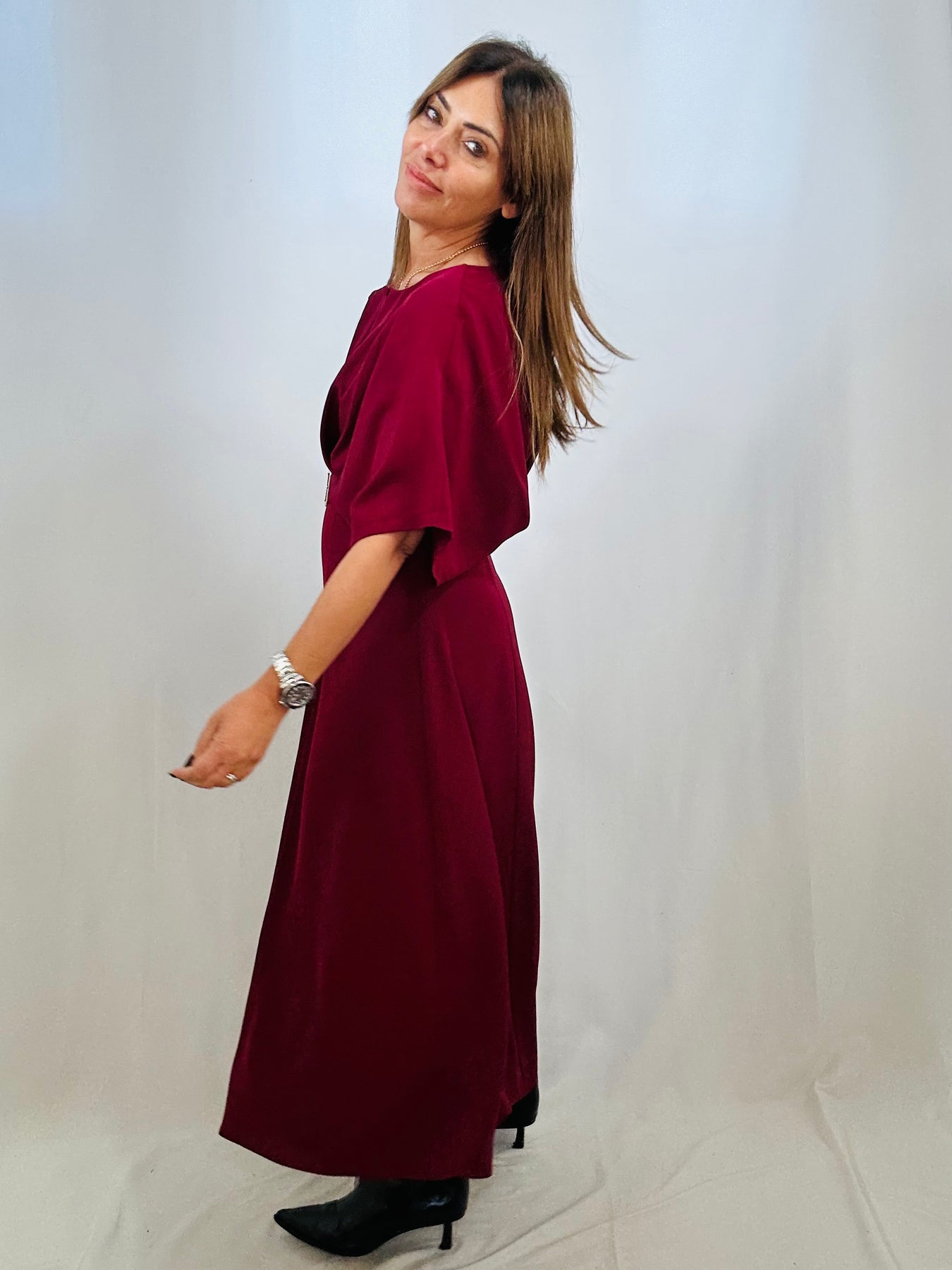 Crafted from premium berry-colored fabric, the Amora dress features a flattering belted waist and elegant mid-length, making it ideal for any occasion. The soft, flowing material and fluted mid sleeves add a touch of sophistication, while the tailored fit emphasizes your natural curves. A must-have for stylish and refined looks.