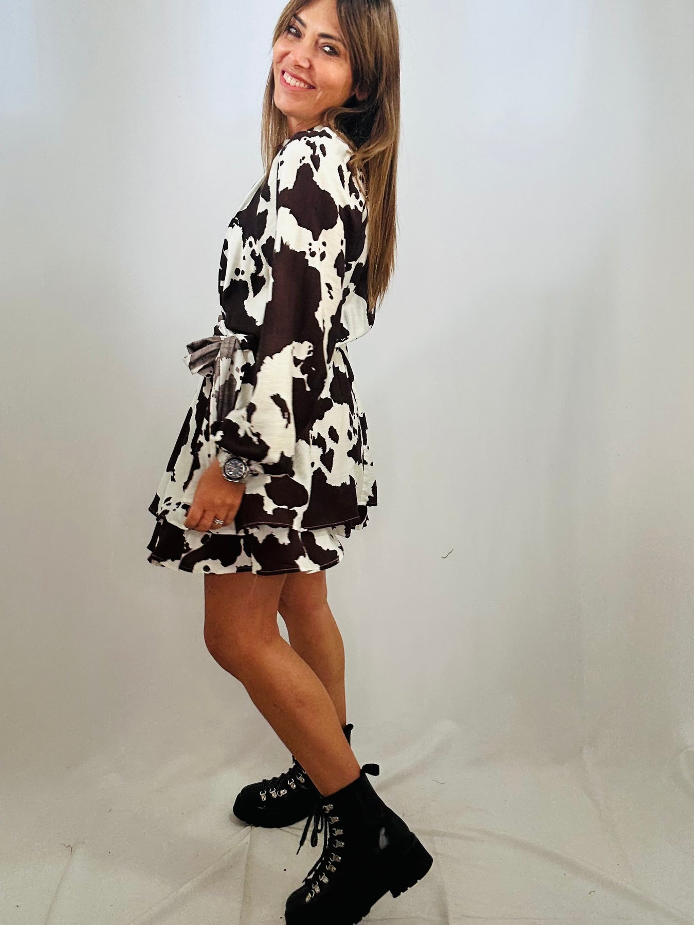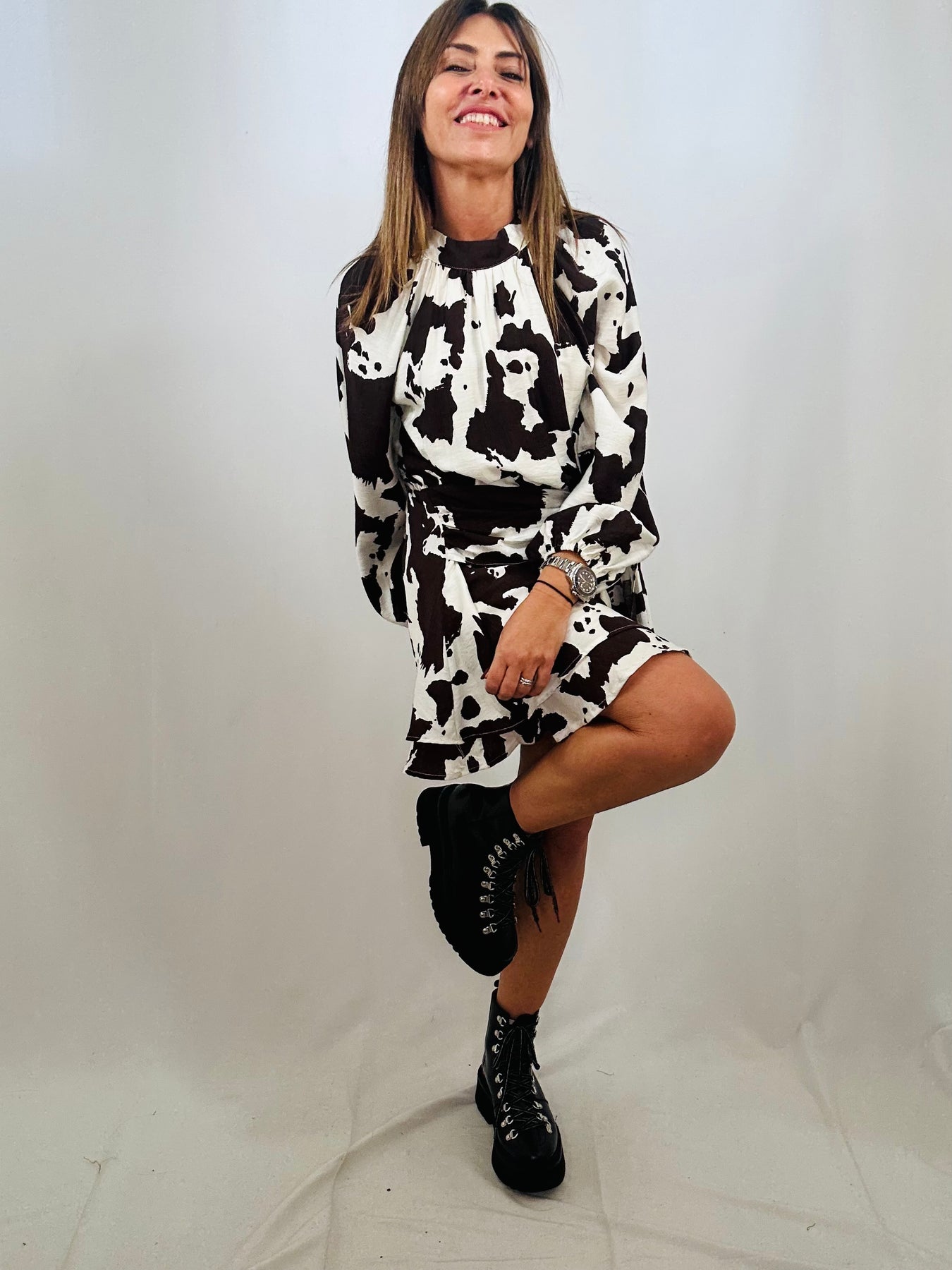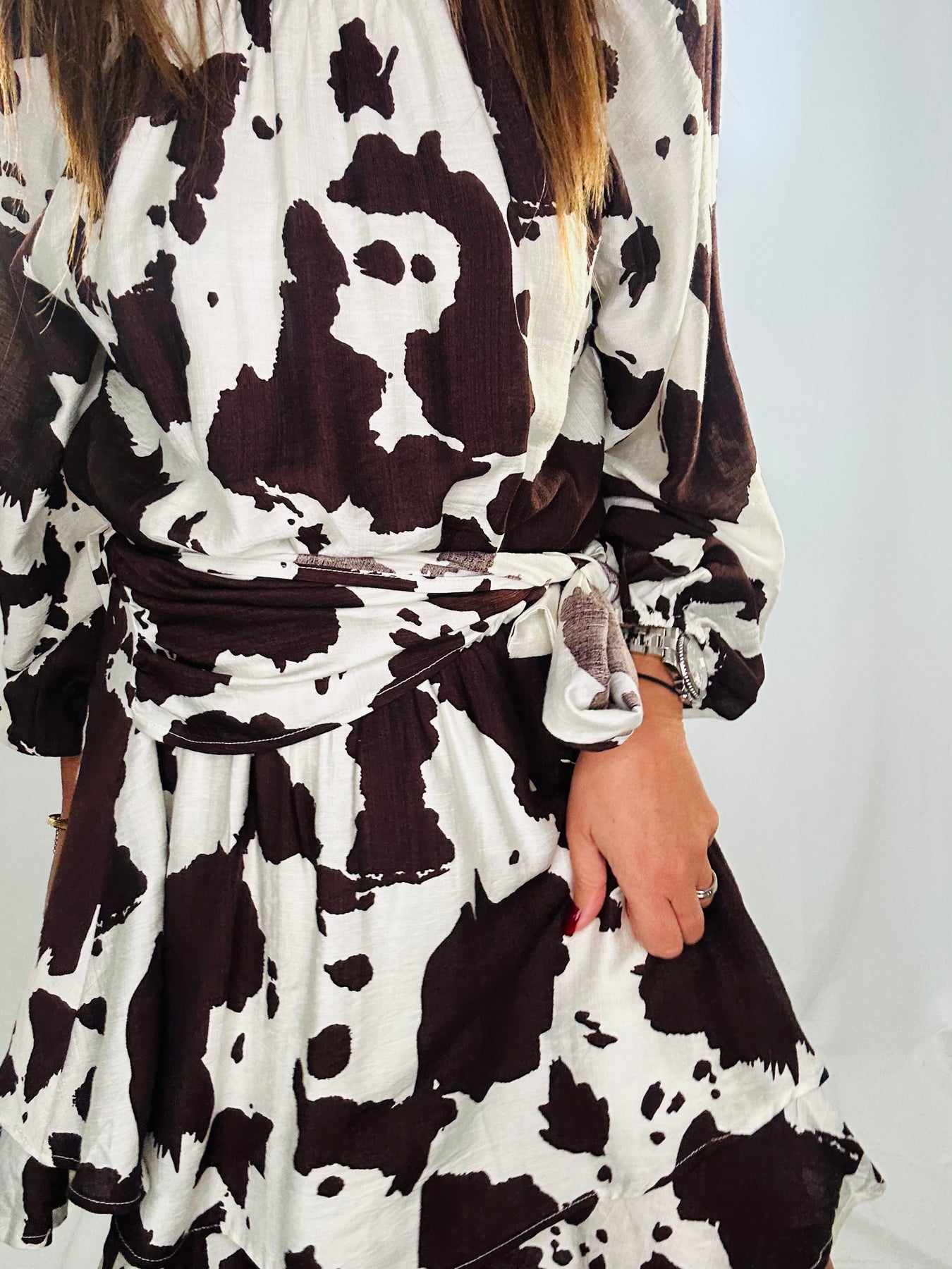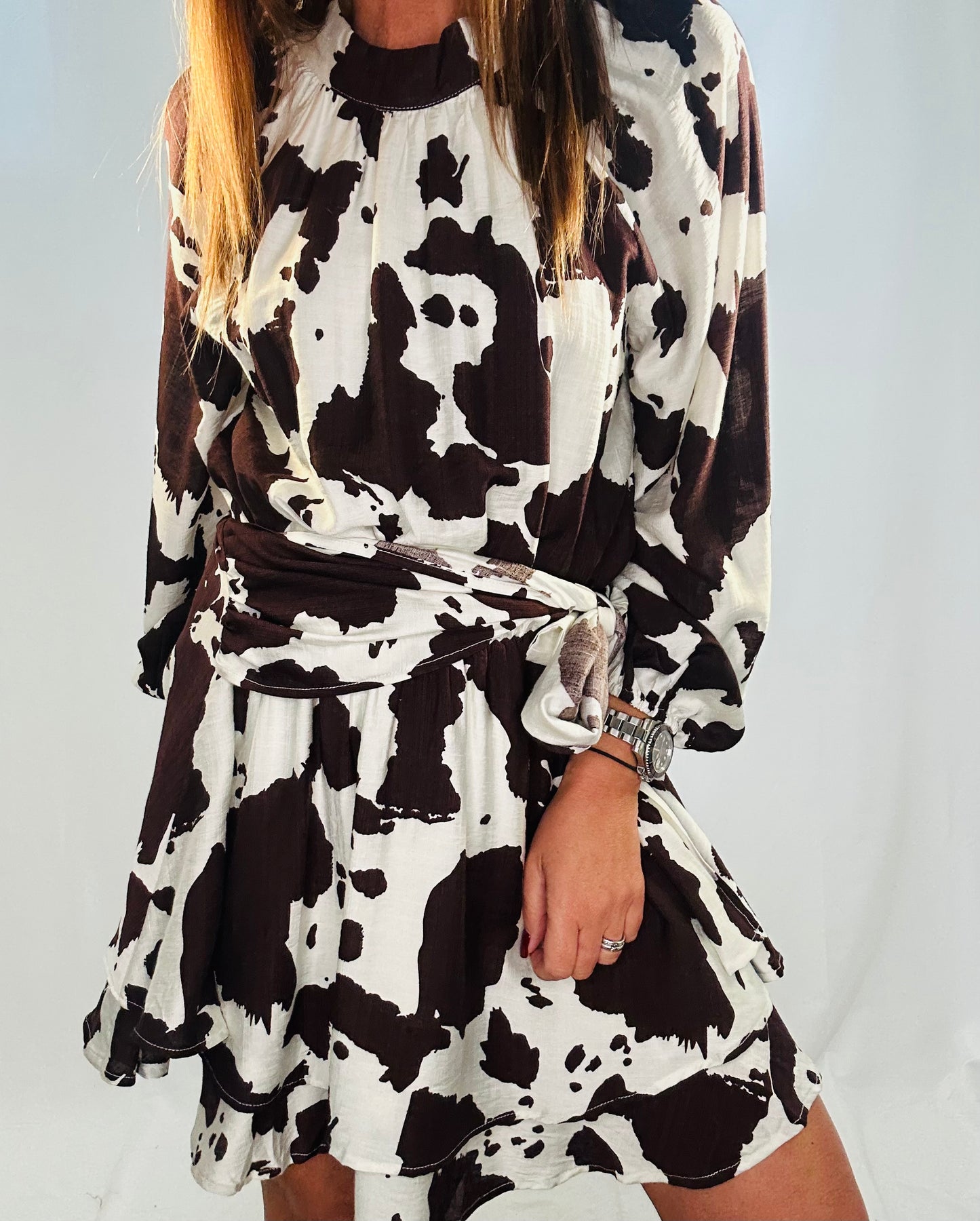 In this season's modern take on animal print, here's our fabulous Charlie cow print mini dress. Crafted from a beautiful, lightweight fabric, offering both style and comfort, the elegant high crew neckline, blouson sleeves and elasticated waist with sash tie-belt creates a flattering silhouette, making it an ideal choice for a night out.