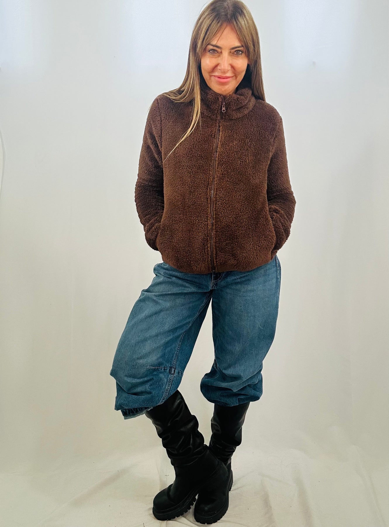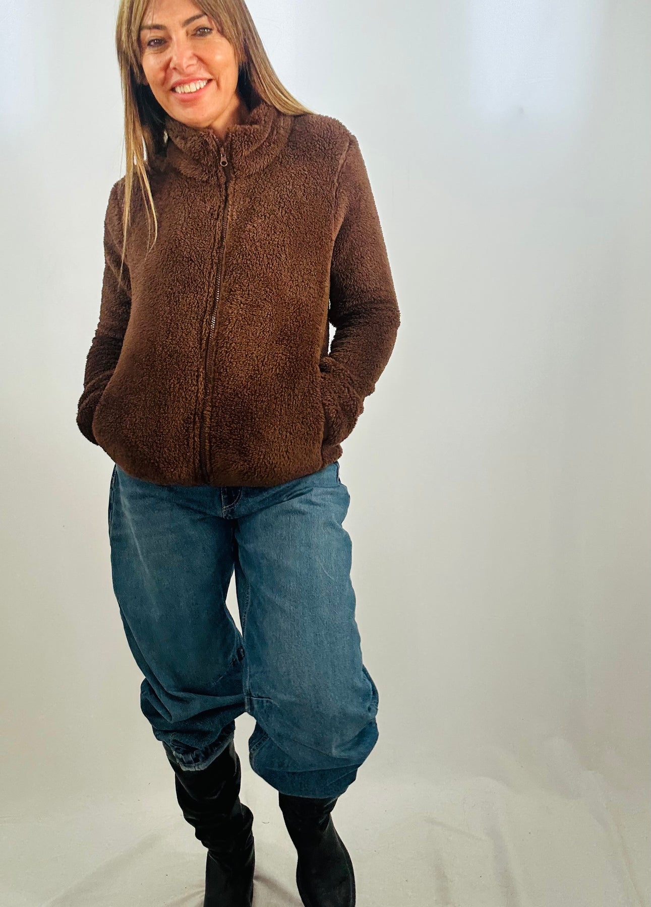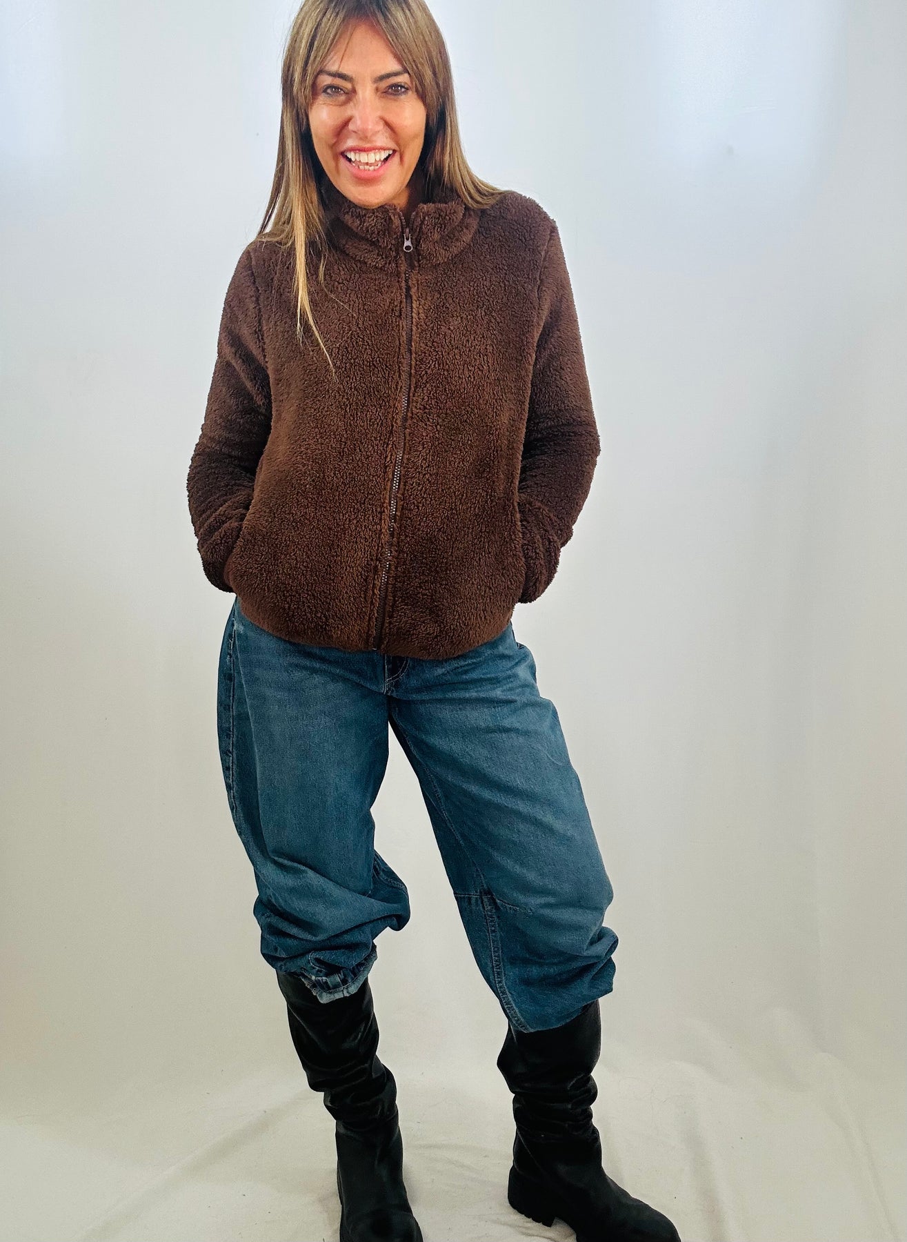 Cozy up in the Rosie Teddy fleece bomber—soft, cuddly, and perfect for cooler days. Featuring a high collar, zipped front, and handy pockets, it’s your ultimate easy layer. Finished in this season’s chocolate shade, it’s the playful pick that’s ready to brighten up chilly moments.