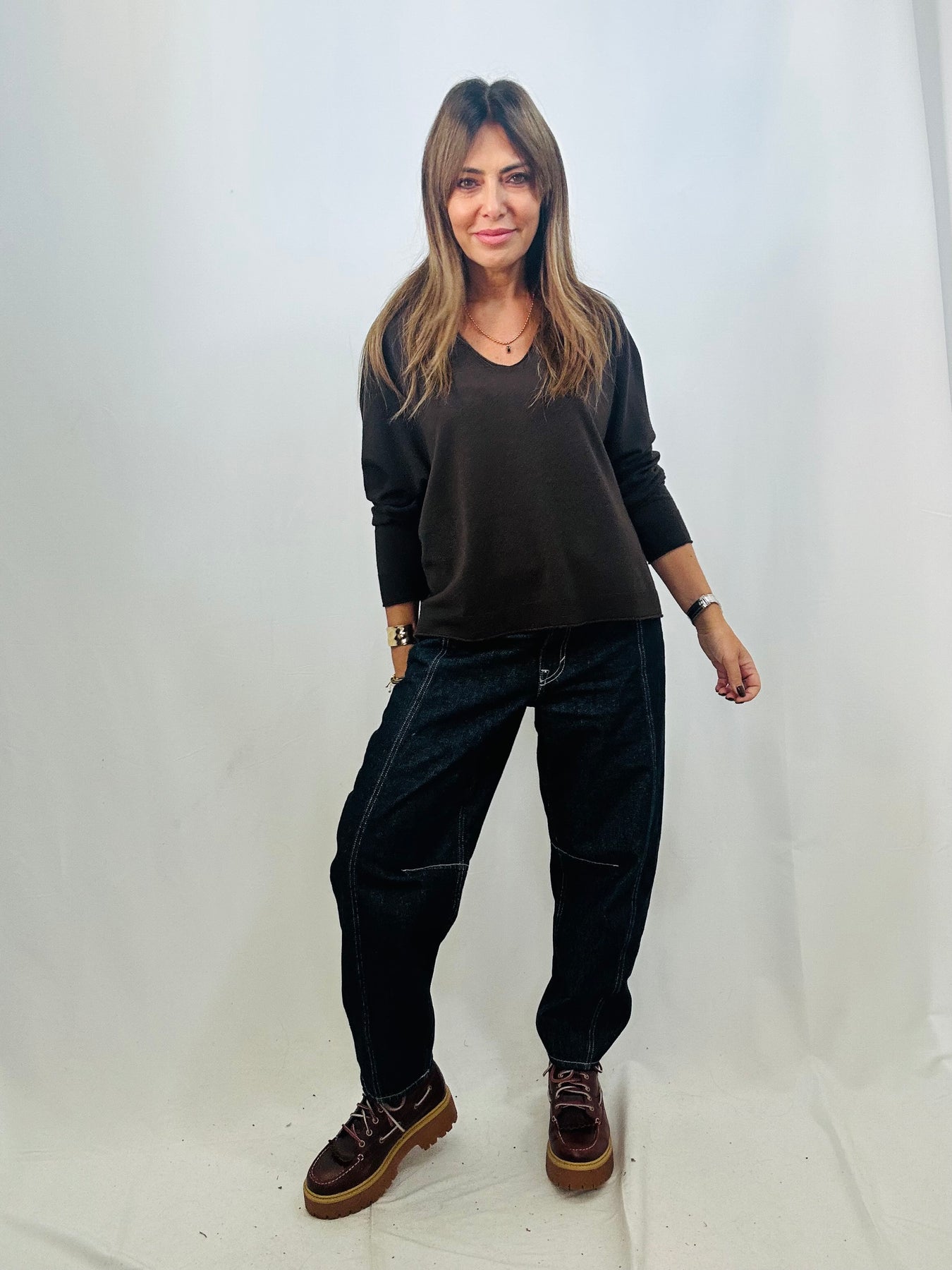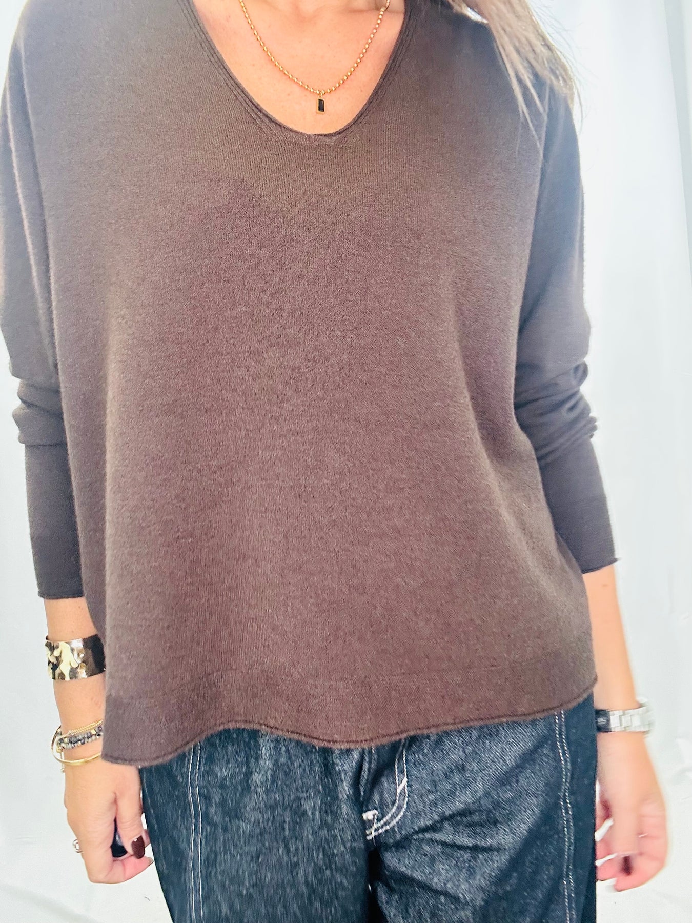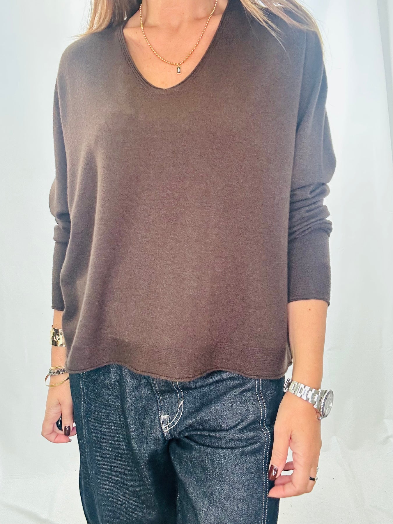 Gentle scoop v neck, long sleeves, relaxed fit, short length, fine ribbed hem and cuffs.