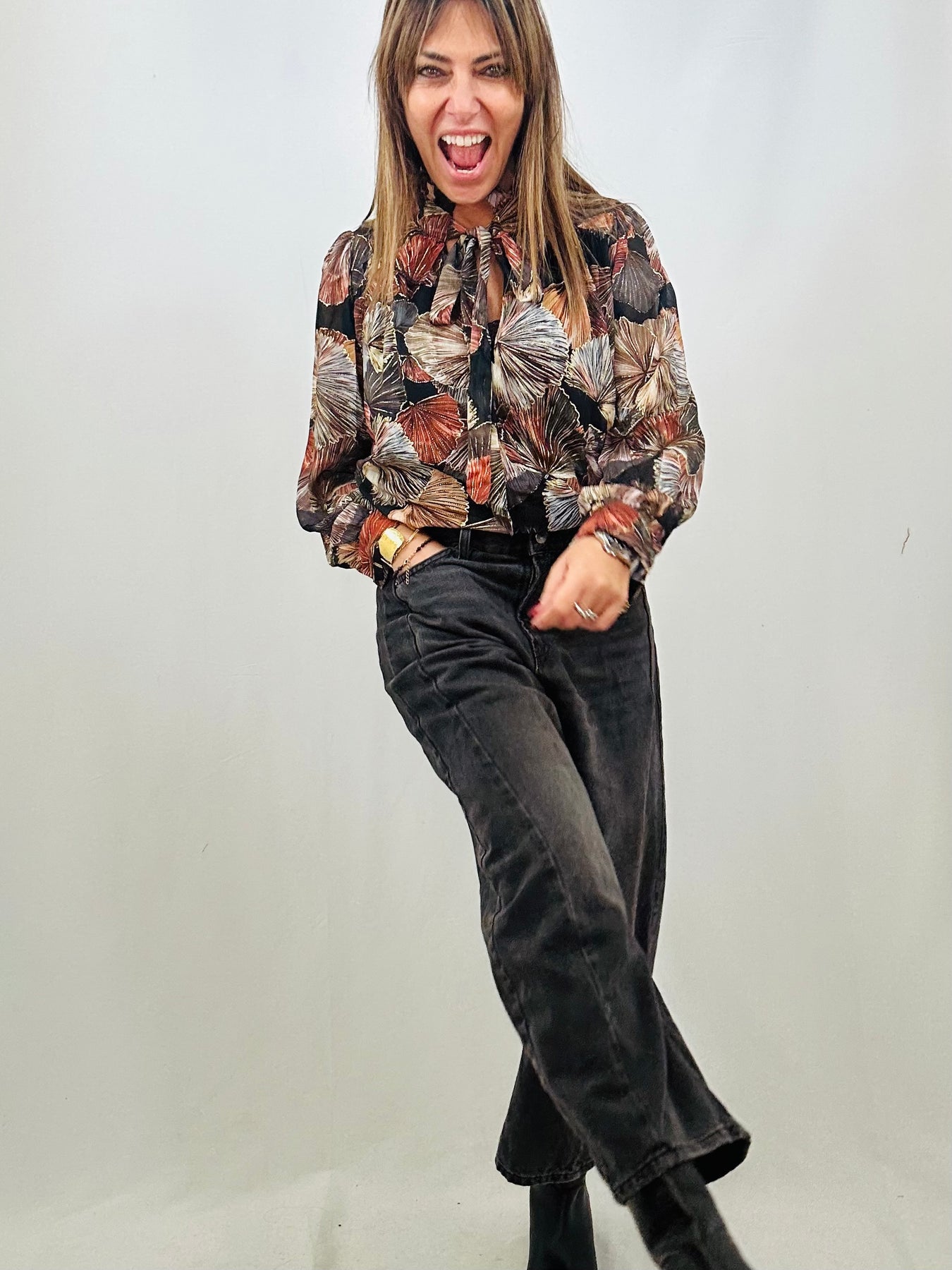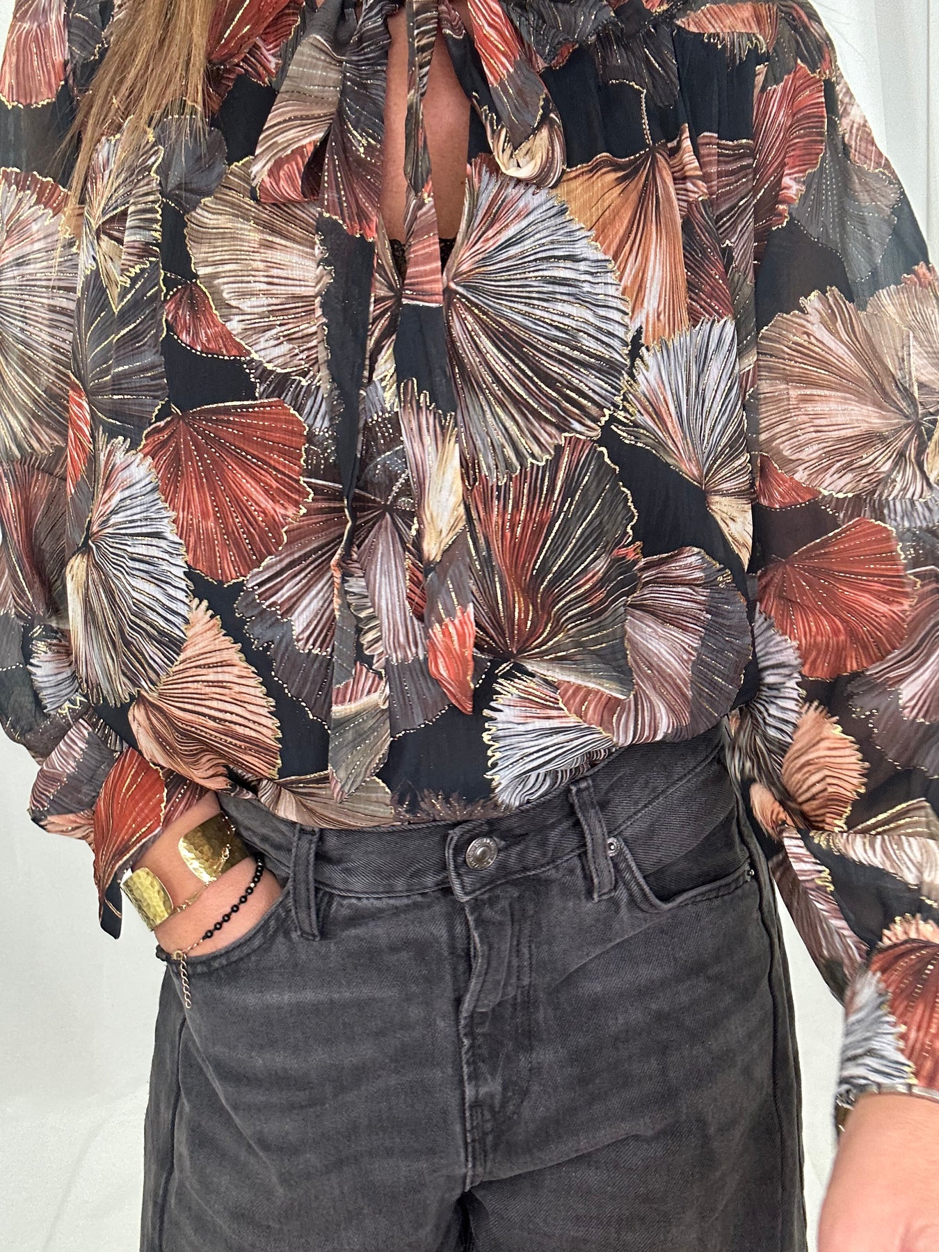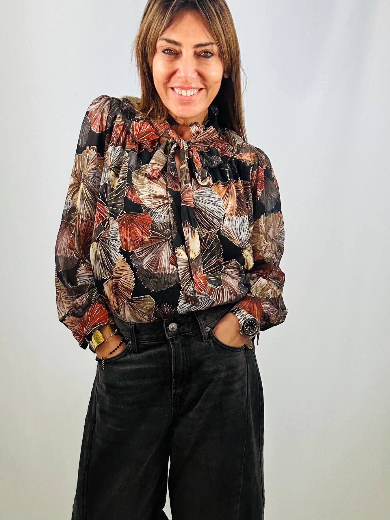 Discover understated elegance with the Rosine frill neck blouse. This chiffon piece showcases a colourful palette enhanced by subtle gold detailing, paired with a graceful frilled neckline and tie closure. Long sleeves with refined cuffs and a lined body complete this timeless wardrobe essential.